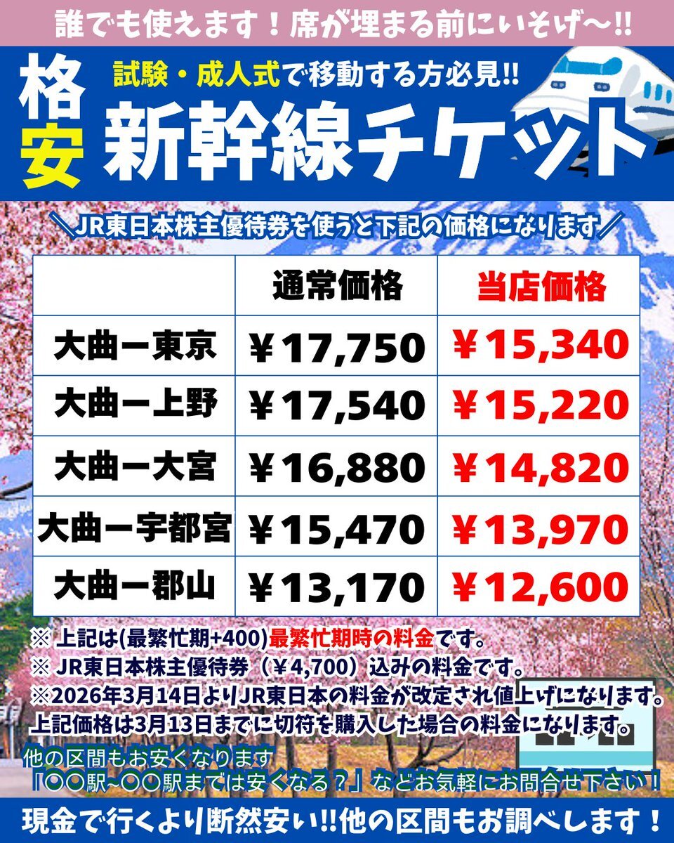 日本海チケット大曲店です! 試験や成人式で移動する方必見‼️ 新幹線 ・飛行機が安くなる割引券を販売中✨ 詳しくはHPをご覧いただくかお問い合わせください🙇♀️ JR➡n-chike-papi.com/sell/zwILXfBO ANA・JAL➡n-chike-papi.com/sell/SELL_kabu… #大仙市 #大曲 #大曲駅 #JR #新幹線 #ANA #JAL #飛行機 #航空券 pic.x.com/ejpdFP0l9x