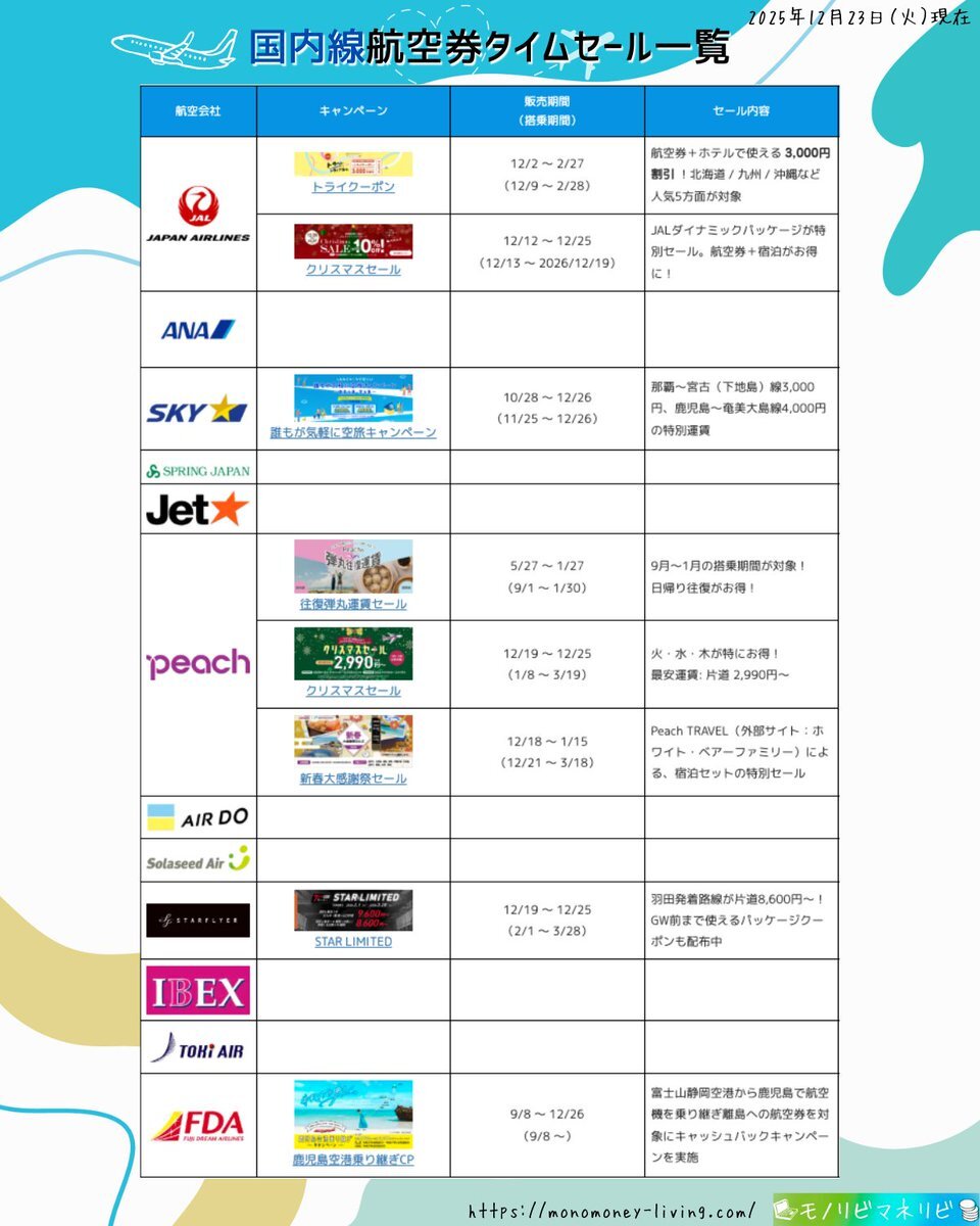 【2025年12月23日(火)】 🉐実施中の国内線航空券タイムセール一覧✈️ 🔍詳細:monomoney-living.com/aircraft-ticke… #国内線航空券タイムセール一覧 #国内線航空券タイムセール #タイムセール #航空券 #JAL #ANA #SKYMARK #SPRINGJAPAN #Jetstar #peach #AIRDO #SolaseedAir #STARFLYER #IBEX #TOKIAIR #FDA pic.x.com/EboVpBzzJs