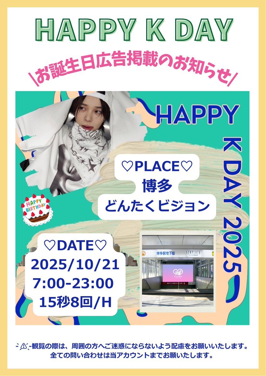 - ̗̀🎂 ̖́- HAPPY K DAY 2025 PROJECT♡⃜ ♡ビジョン広告掲載のお知らせ♡ 博多どんたくビジョンに広告掲載いたします🙌🏻💖 たくさんの方に見ていただき、一緒にお祝いできますように✨✨ 📍博多どんたくビジョン 📅2025/10/21 🕰️7:00-23:00 15秒8回/H #HAPPYKDAY2025 #andTEAM_K pic.x.com/ns9i3YQrxy x.com/happykday2023/…