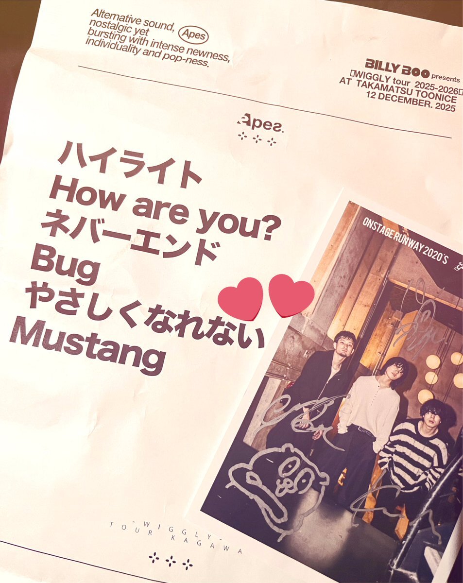 高松tooniceにてBILLY BOOのツアーにお呼ばれApesさん 半年振りだったけど思わず踊ってしまうご機嫌な曲達とApesといえばな曲の繋ぎのカッコよさにも痺れた 対バンでも新曲をセトリに入れる攻めの姿勢も良いよね ずっと温めてたglambのポストカードがキラキラになった🙂‍↕️✨🍯🐻 #apesband #Apes pic.x.com/Ht551TTjVW