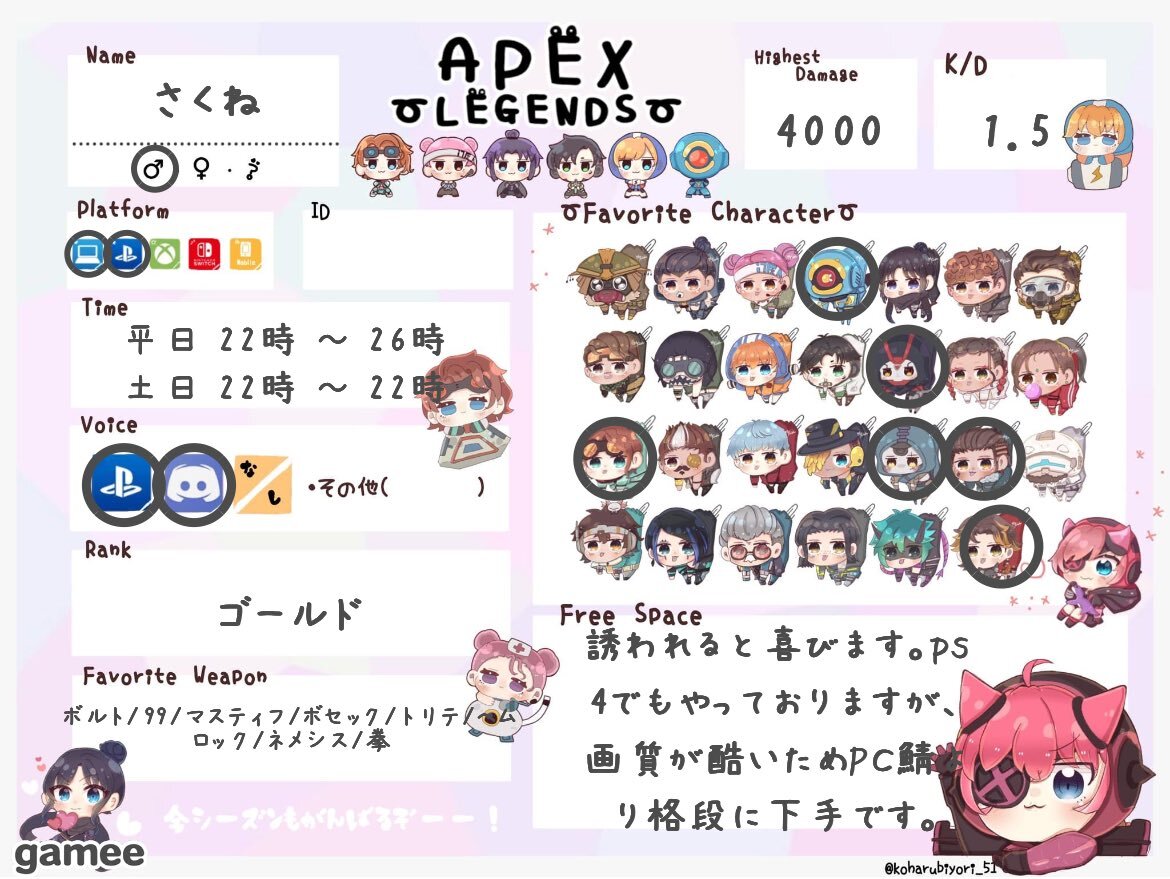久しぶりにお友達募集〜 現在23の歳だけ若いおぢさんです。 話なれるとうるさいです。 凸るのが好きなのでぜひともなにとぞ、、、 PCの方が動けます(:3_ヽ)_ #Apexフレンド募集 #apex #apex自己紹介カード #Apex募集pc pic.x.com/FnzpktMKCd