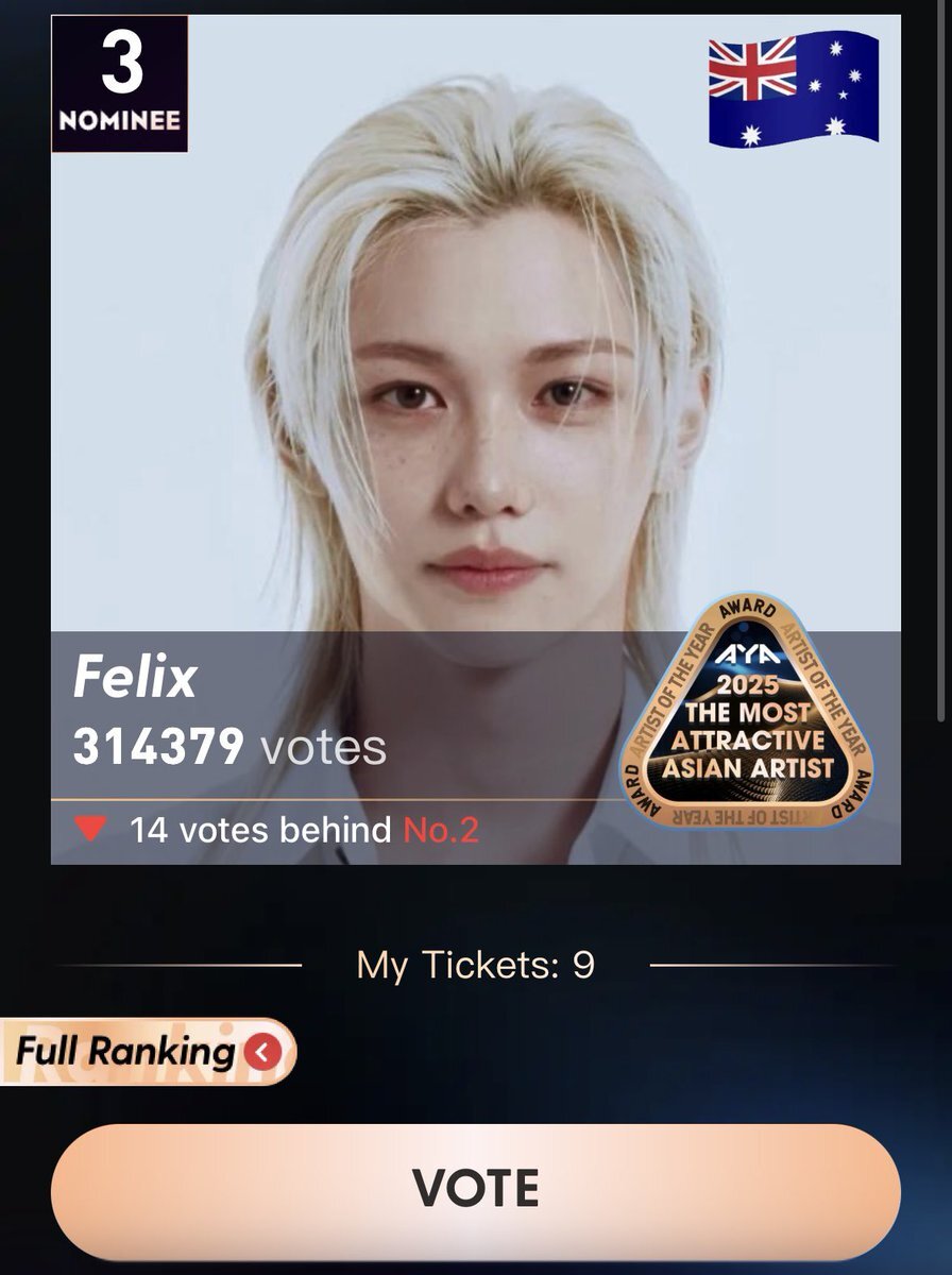I vote #Felix for 2025 THE MOST ATTRACTIVE ASIAN ARTIST. Current Rank: 1🥇 #AYA #ARTISTOFTHEYEARAWARD ayaglobal.club/idol/594 シェアしてもらえる3🎫って貯めれるって知らなかったー! pic.x.com/39bdcWK3Ac