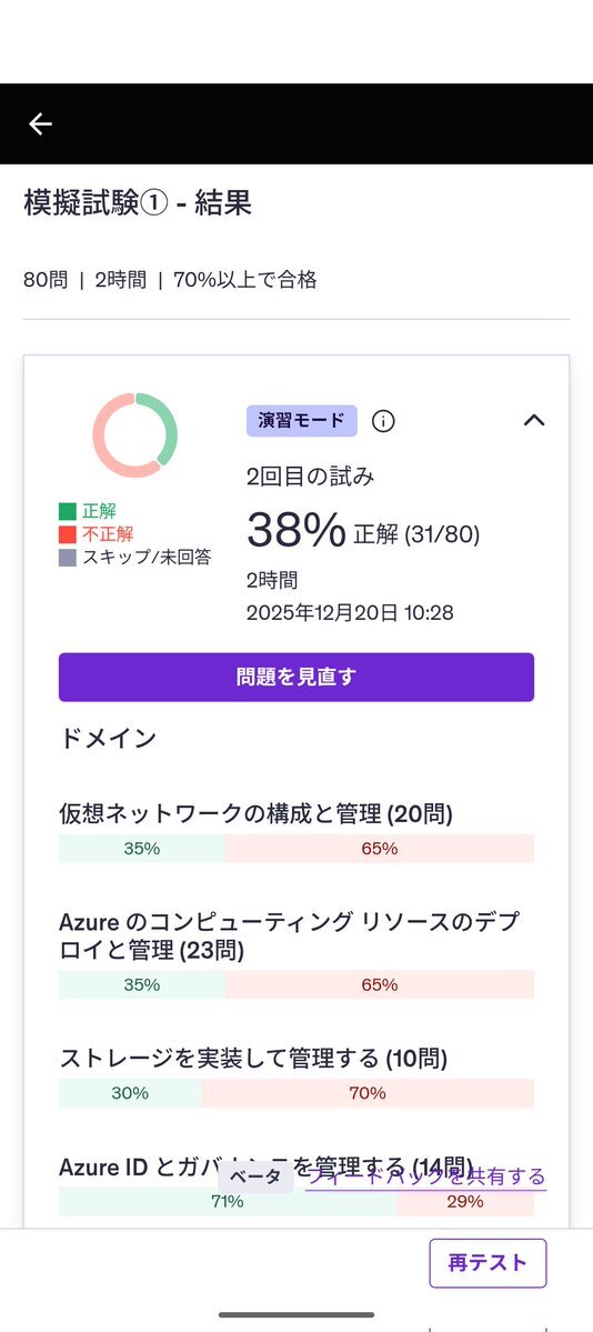 前回は45%→69% 今回は39%→70% ということで、少しずつ理解が進んでいる、はず 単に丸暗記力()が上がっているだけかもしれないけど #Azure pic.x.com/iXp7PbGDA0 x.com/establishtodo/…