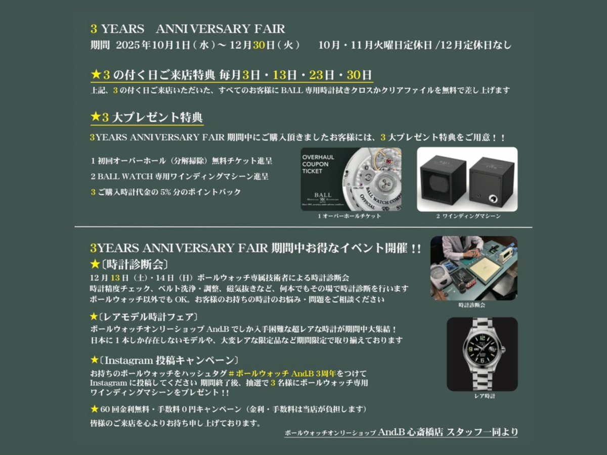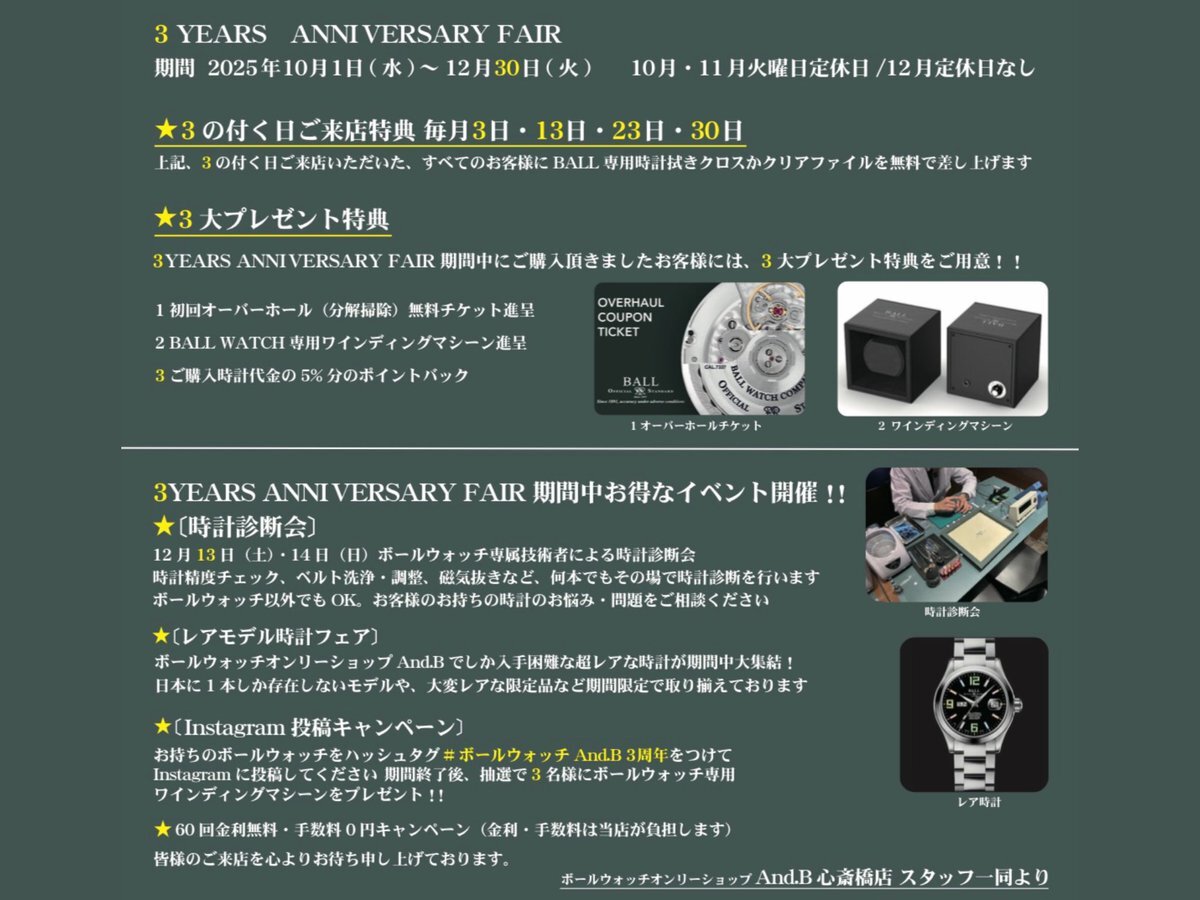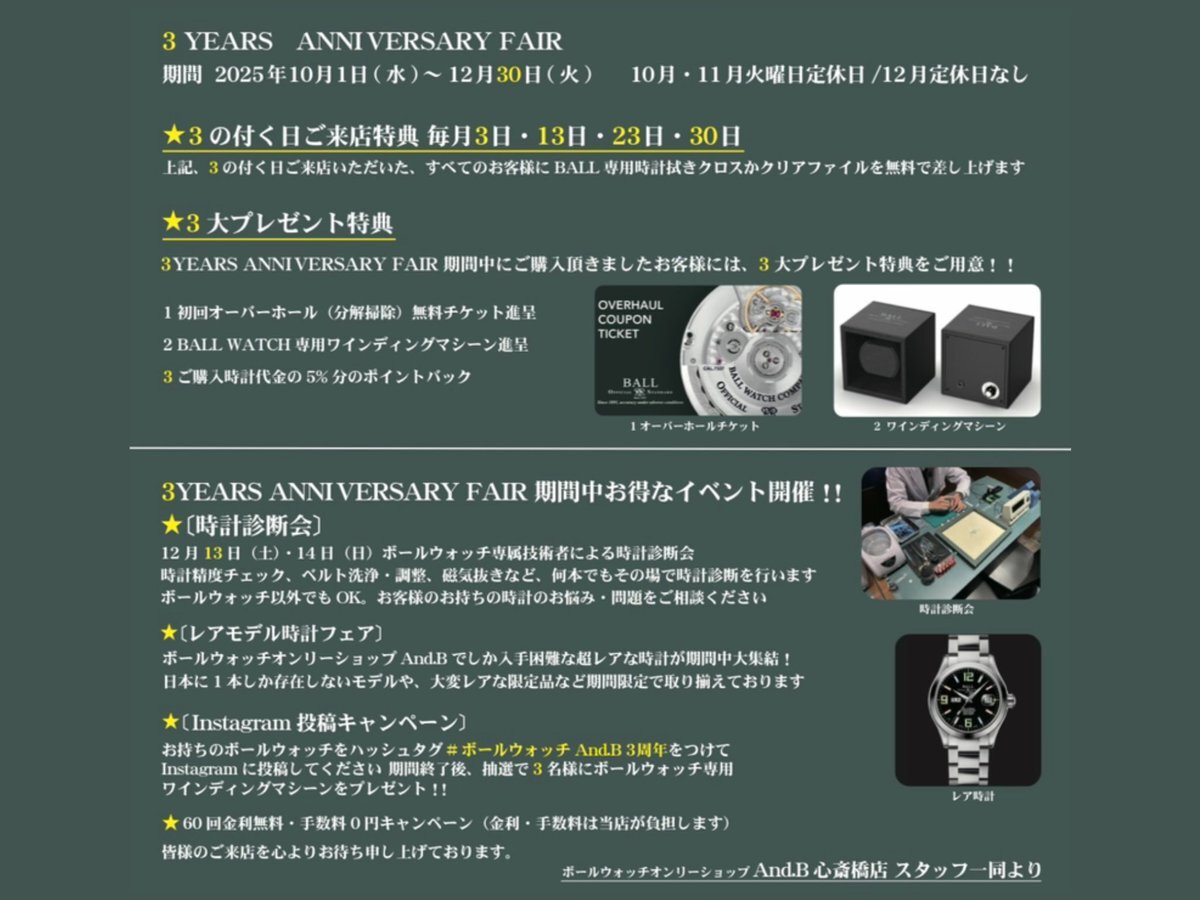 🎉本日10/3(金)は3のつく日来店特典デー🎉 BALL WATCH And.B【3周年記念フェア】開催中✨ 来店で クリアファイル・専用クロス・ステッカー プレゼント🎁 購入で豪華3大特典も!⌚ 超レアモデルも店頭に並んでます🙌 #ボールウォッチ #ballwatch #腕時計 #機械式時計 pic.x.com/AqW9UzwjMI