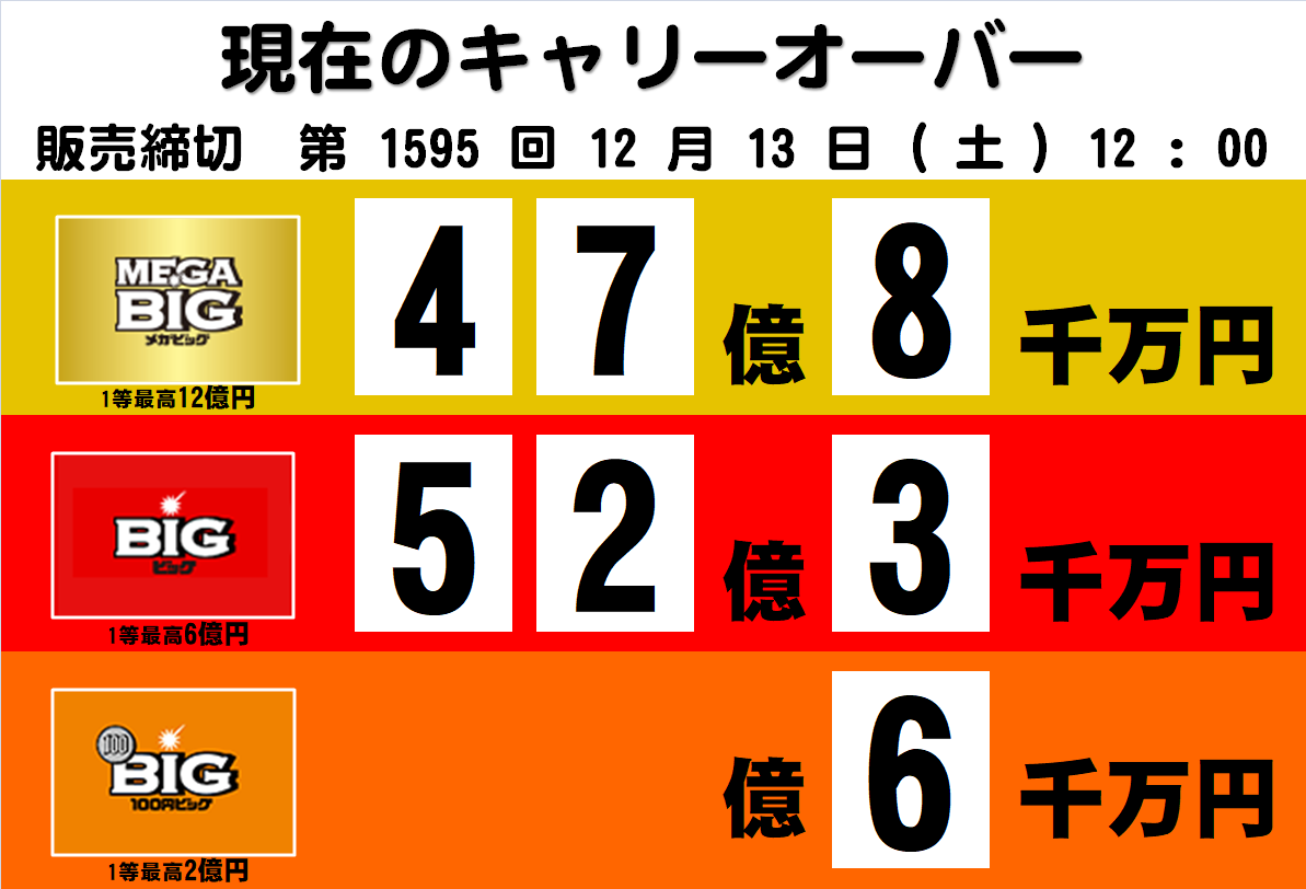【クリスタ長堀店】 第1595回 BIG⚽️各種に #キャリーオーバー 発生中🤩 #MEGABIG 約47億8千万円 #BIG 約52億3千万円 #100円BIG 約6千万円 本日12時締切🕛 #チケットキャビン #宝くじ #チケットキャビンクリスタ長堀店 pic.x.com/z4gId34Iro