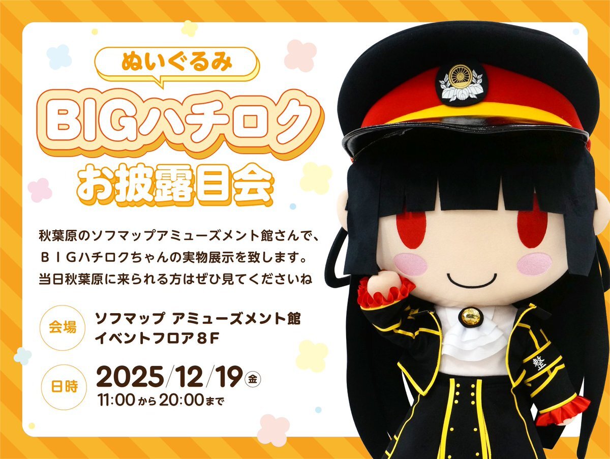 【イベント告知】BIGハチロクぬいぐるみのお披露目会をさせていただきます!😊 場所はソフマップ アミューズメント館様 8Fイベントフロア! PCゲーム購入者向けイベントの一角にBIGハチロクがくる~~!!💪✨ 写真撮影OKですし、係員にお声掛けいただければ触っていただいてOKです!