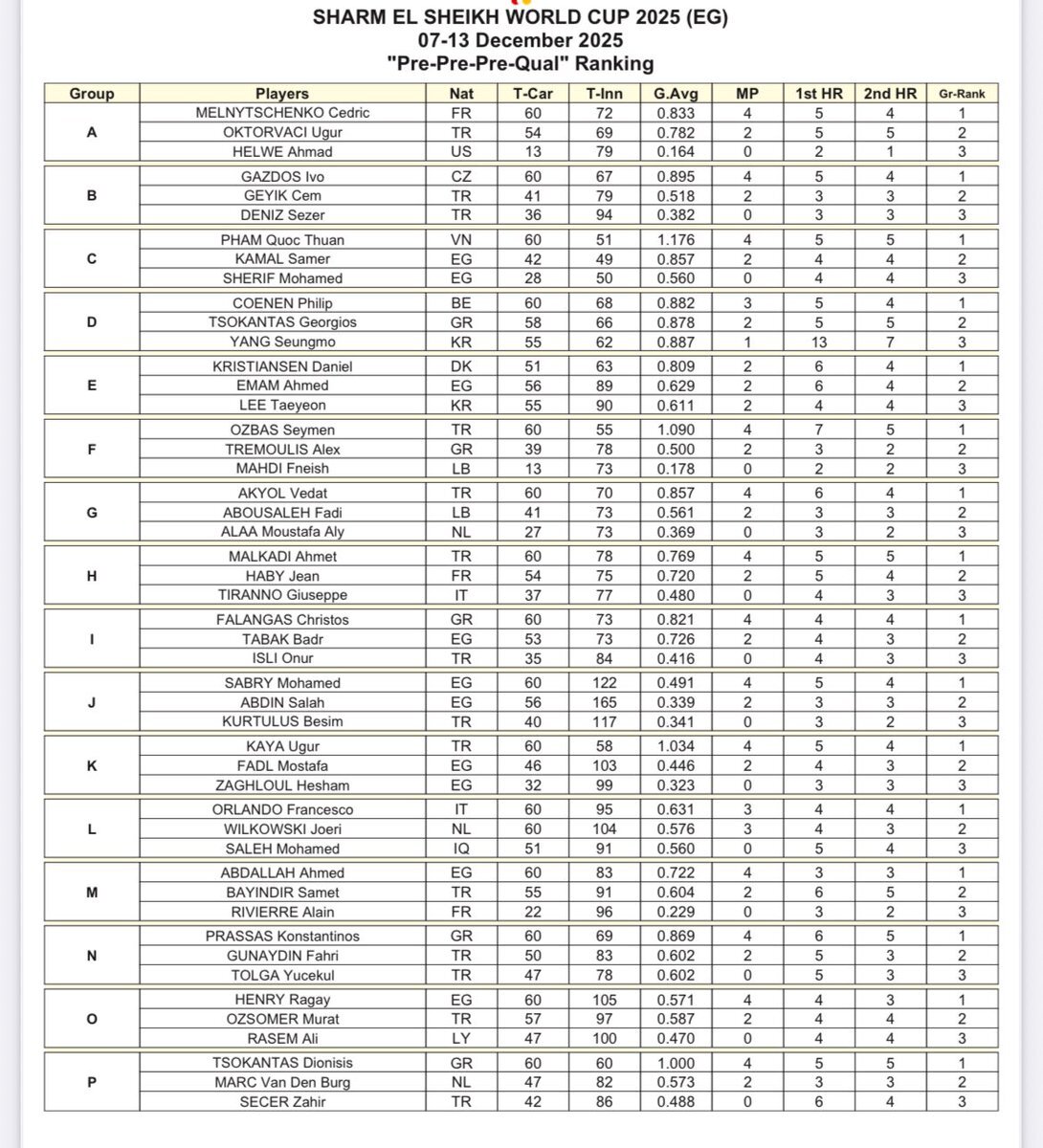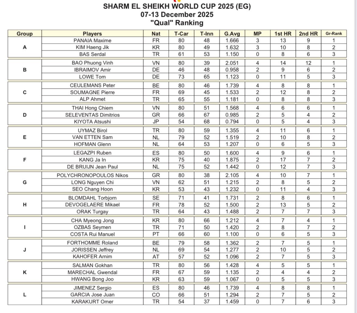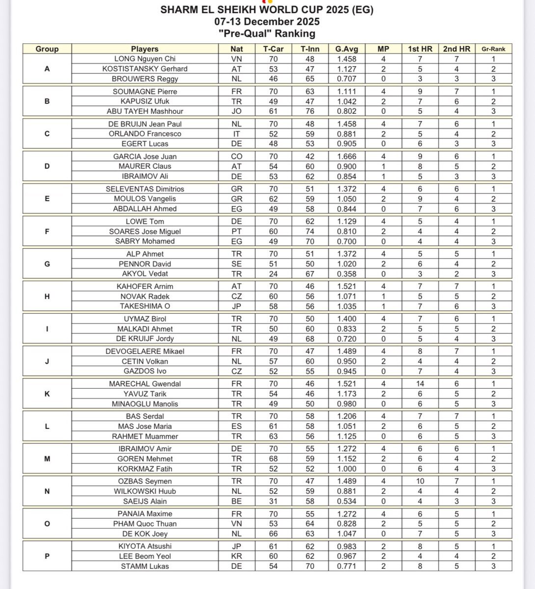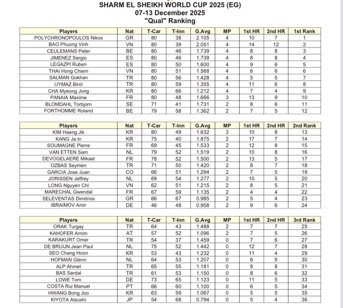 エジプト🇪🇬スリークッションワールドカップ 最終予選リザルト 🇯🇵清田はグループ3位で決勝グループリーグ進出ならず 🇳🇱ホフマン、ブリュイン、🇹🇷オズバス、🇨🇴ガルシアもここで敗退 #billiards #ビリヤード #スリークッション pic.x.com/smRUmRsSez