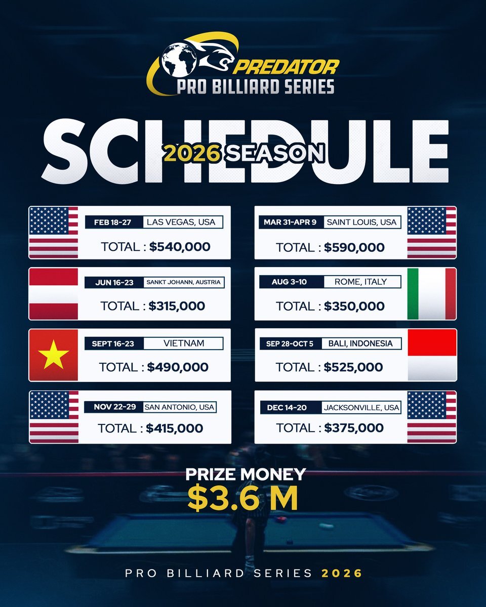 記事アップ:〈BD〉2026年PBSスケジュール決定。全8戦にスケールアップ。年間総賞金は約5億6千万円に。チーム10ボール世界選手権復活 billiards-days.com/20251211-1/ #billiards #ビリヤード pic.x.com/WIbq2dxToy