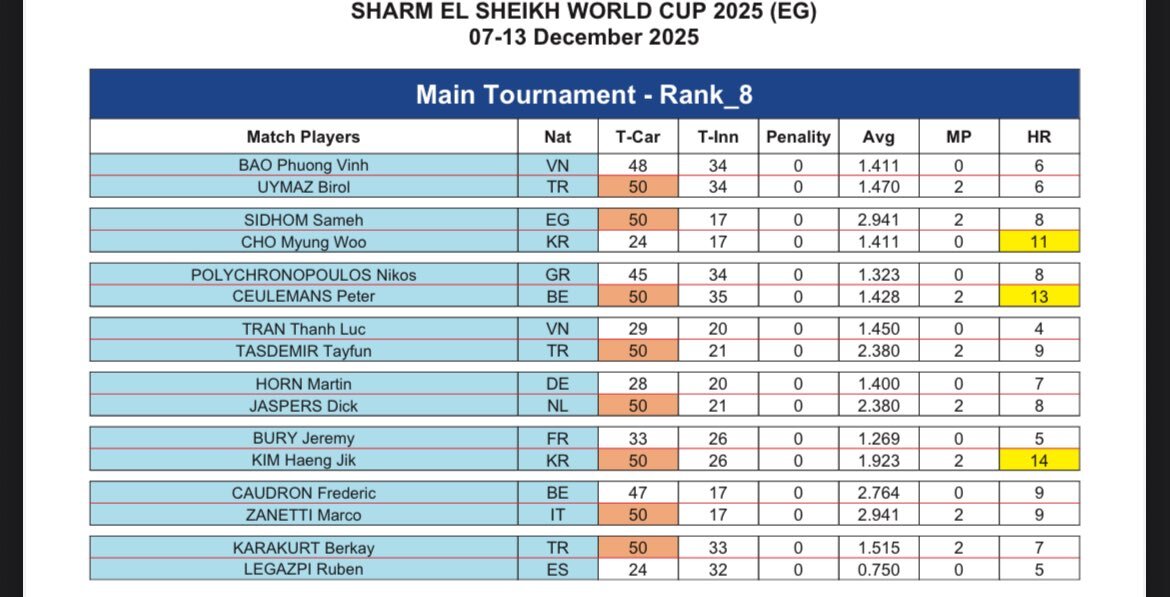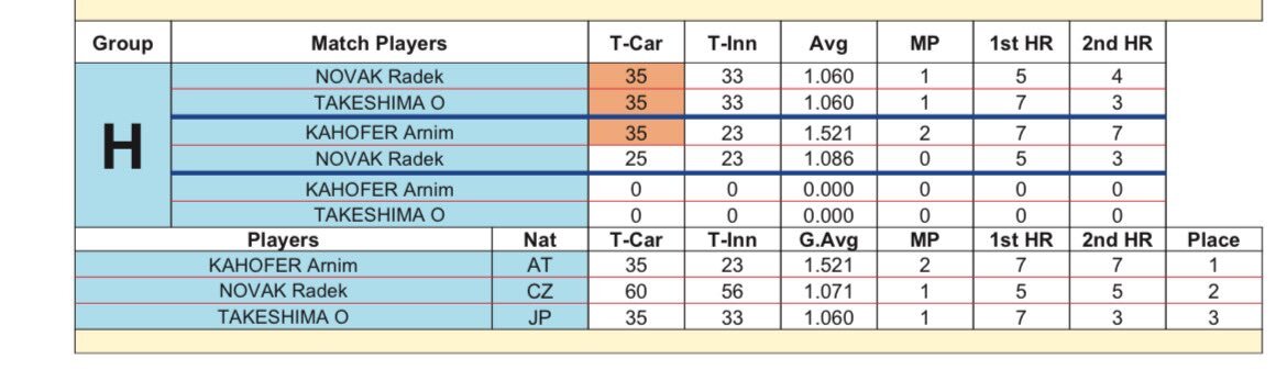 エジプト🇪🇬スリークッションワールドカップ PPQリザルト 今日のPQグループHに🇯🇵竹島が出場する。 同組の🇦🇹 アルニム・カーホーファーはクラシックキャロムの名手 今年の欧州選手権ボークライン71/2で優勝してる #billiards #ビリヤード #スリークッション