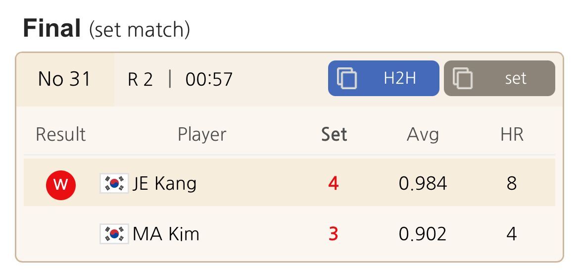エジプト🇪🇬スリークッションワールドカップ ベスト16前半のリザルト 🇪🇬シドムが🇰🇷ミョンウにAve2.941で勝利 #billiards #ビリヤード #スリークッション pic.x.com/dajSRkl7AU