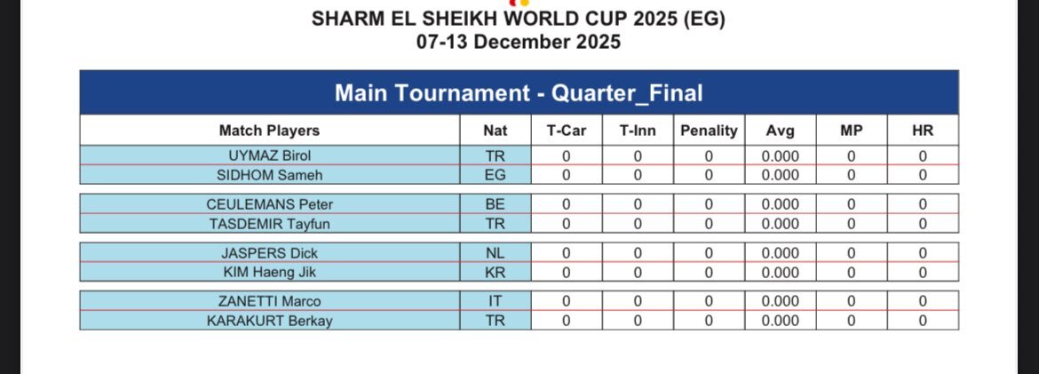 エジプト🇪🇬スリークッションワールドカップ ベスト16リザルトとベスト8組み合わせ クードロンvsザネッティー 2アベ後半の戦いはザネッティーの勝利 #billiards #ビリヤード #スリークッション pic.x.com/6ILnkHvB4O