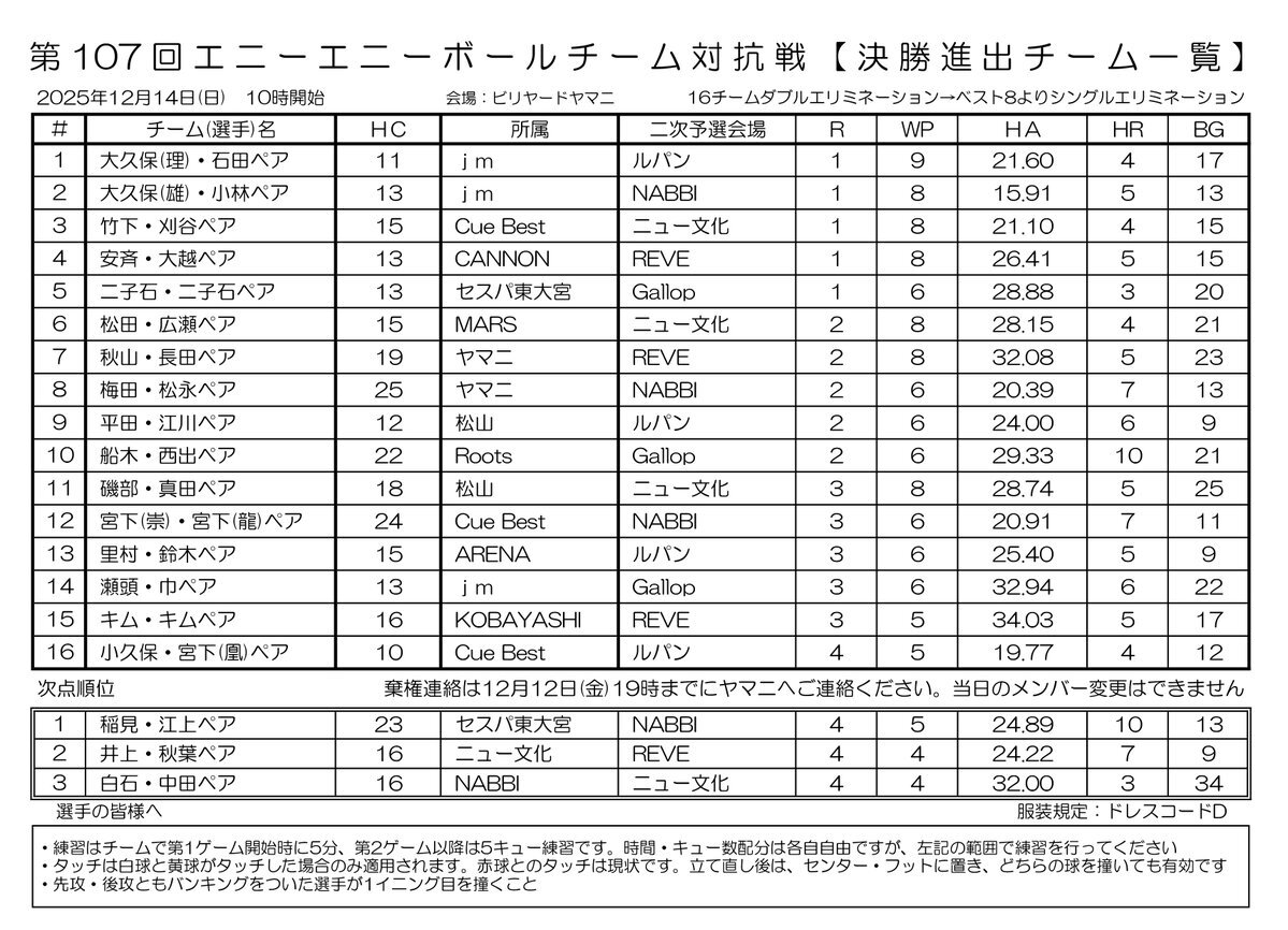 【確定版】【エニーエニー】 第107回 エニーエニーボールチーム対抗戦 確定版 決勝戦の組み合わせです NBA関東支部 発行 #キャロム #carom #3cushion #three_cushion #3cushion #スリークッション #3クッション #ビリヤード #billiards #Billiard #Billiards #エニーエニー pic.x.com/XkeXOEOWdc