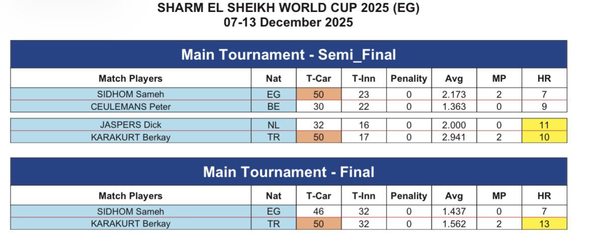 エジプト🇪🇬スリークッションワールドカップ セミファイナル&ファイナルのリザルト 優勝は🇹🇷ベルカイ・カラクルト! 🥈地元🇪🇬サーメフ・シドム 🥉🇧🇪ピーター・クールマンス、🇳🇱ディック・ヤスパース カラクルトはWC初優勝! #billiards #ビリヤード #スリークッション pic.x.com/TlxqYe8694
