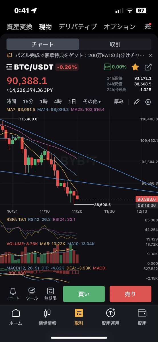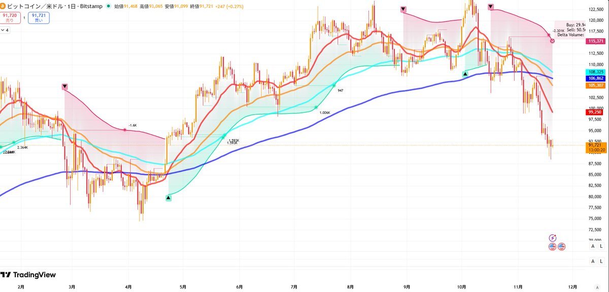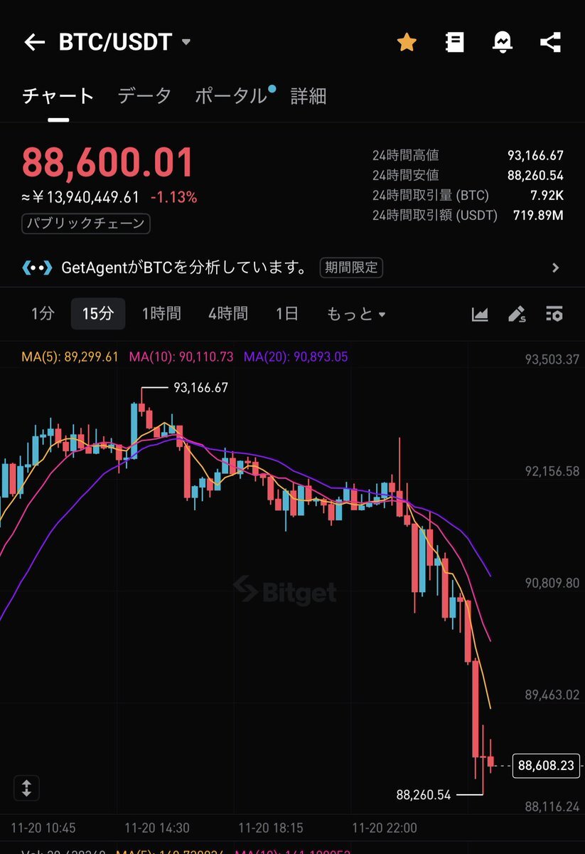 代表的な暗号資産(仮想通貨)であるビットコインは売りが継続。対ドルでは一時8万8389ドル前後と4月22日以来約7カ月ぶりの安値を付けたほか、対円では1394万円台まで売られる場面があった。 #BTCUSD #Bitcoin