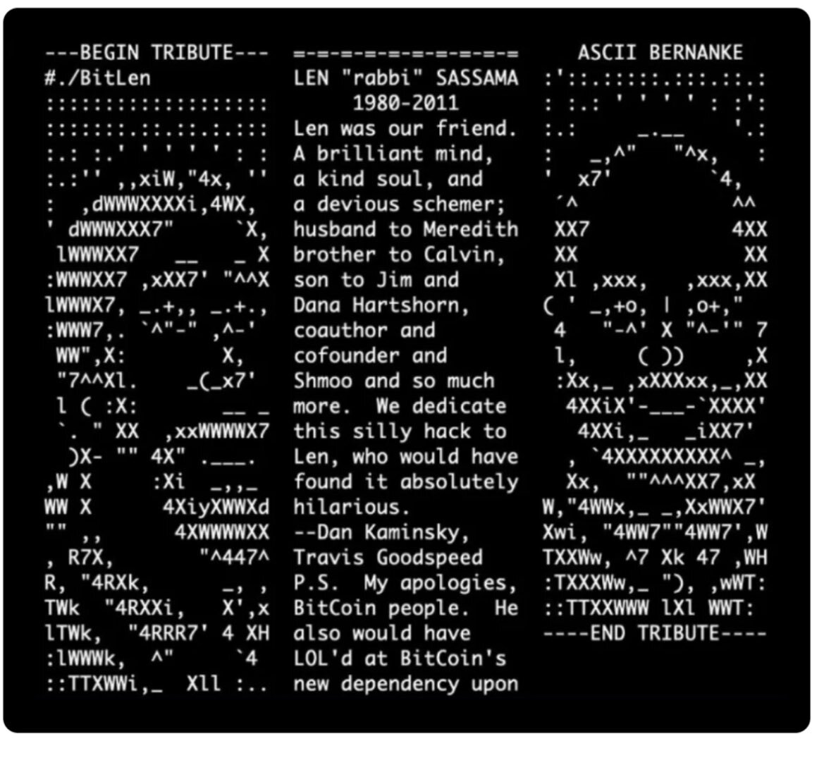 bitcoin 138725番目のブロックに刻まれた追悼文🪦 こういうのなんかかっこいいなぁ "このブロックには、アメリカの技術者であり暗号学者でもあるレナード・ハリス・サッサマンをアスキーアートで追悼するトランザクションが含まれています。" どうやったら確認出来るのかな⁇ #BTC #bitcoin pic.x.com/Js9EzDrY96