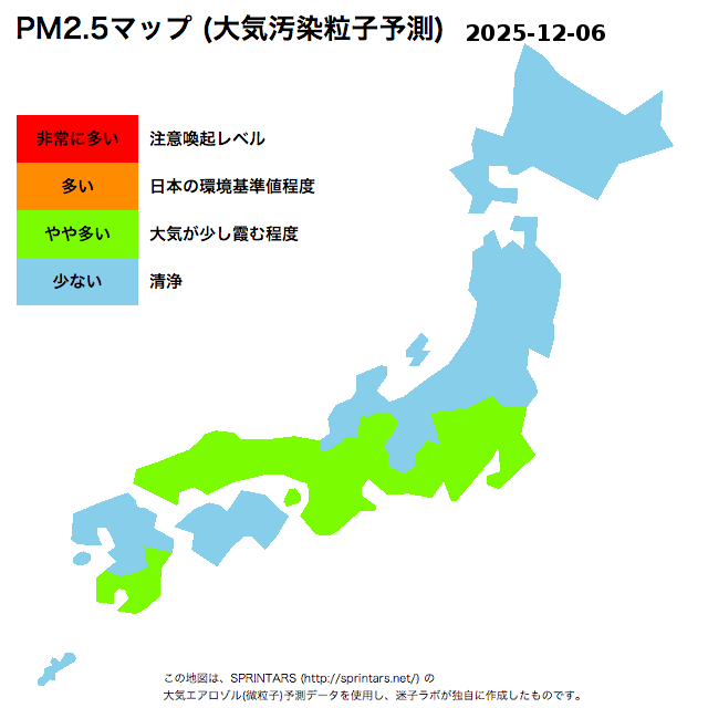 【PM2.5マップ 大気汚染粒子予測】12月6日 やや多い: 首都圏、東海地方、近畿地方、中国地方、九州南部 SPRINTARS sprintars.riam.kyushu-u.ac.jp/forecastj.html #bot pic.x.com/zYdZk7DO5n