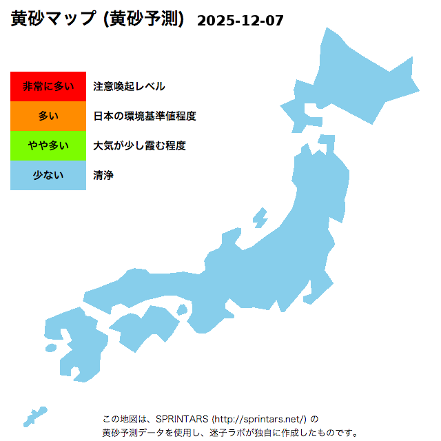 【黄砂マップ】12月7日 少ない: 北海道、東北北部、東北南部、首都圏、北陸信越、東海地方、近畿地方、中国地方、四国、九州北部、九州南部、沖縄 SPRINTARS sprintars.riam.kyushu-u.ac.jp/forecastj.html #bot pic.x.com/RffFsqmKZB