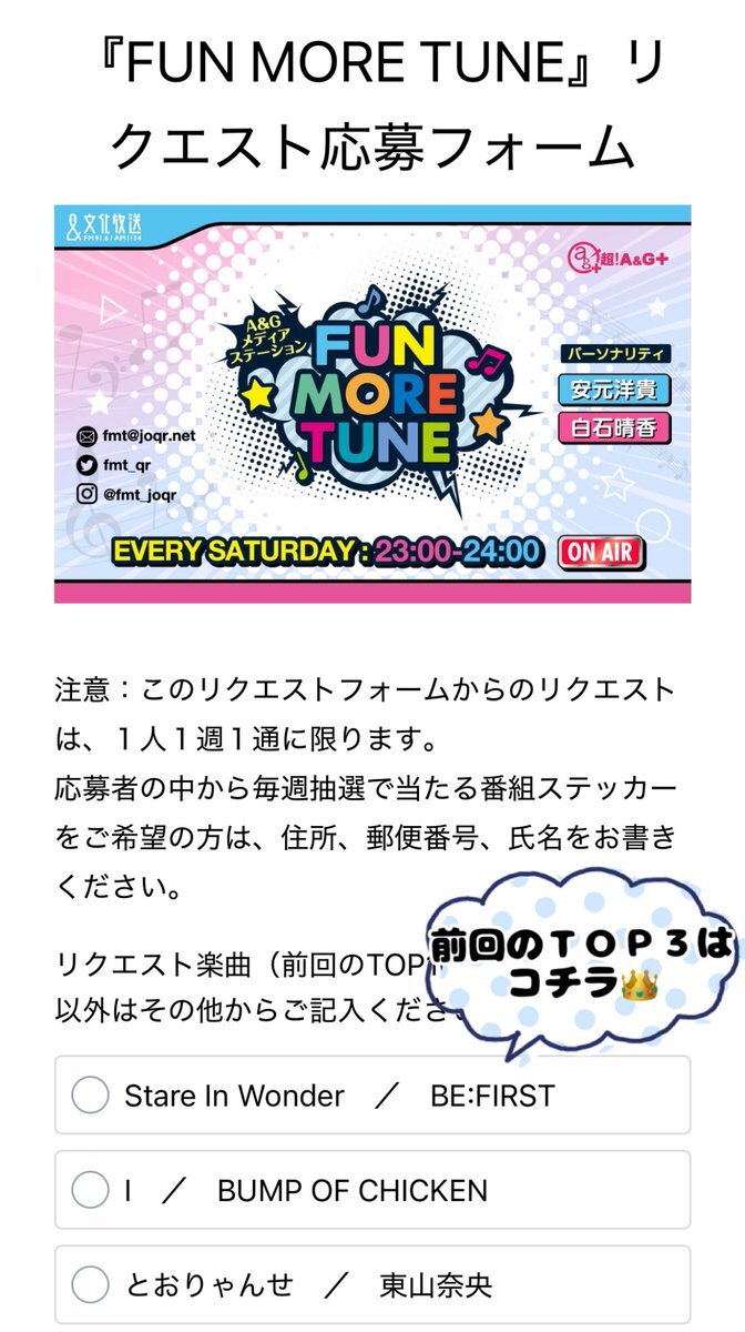 / FUN MOREランキングを決める 楽曲リクエストを随時受付中‼ \ リクエスト専用フォームはコチラ ➡form.run/@joqr-fmt ぜひお待ちしております✨ ※同じ方からのリクエストは1票とさせていただきます。 #FUNMORETUNE #ふぁんも #agqr #文化放送 #BEFIRST #BUMPOFCHICKEN #東山奈央 pic.x.com/Kd4jbPuXAo
