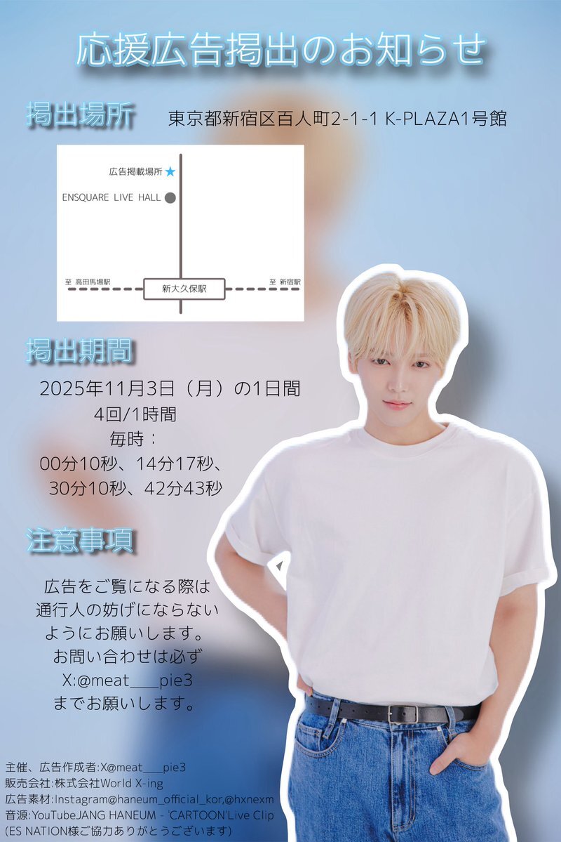 ₊˚⊹ 応援広告掲出のお知らせ ⊹˚₊ JANG HANEUM ブランドアンバサダー就任記念サイン会開催を記念して応援広告を掲出いたします🌷 📍JR山手線新大久保駅徒歩3分 🗓2025/11/3(月) 詳細は画像をご確認ください🌸 #장한음 #한음 #JANGHANEUM #HANEUM #チャンハヌム #ハヌム #CARTOON #Omnibus pic.x.com/iUeFoLfWq3