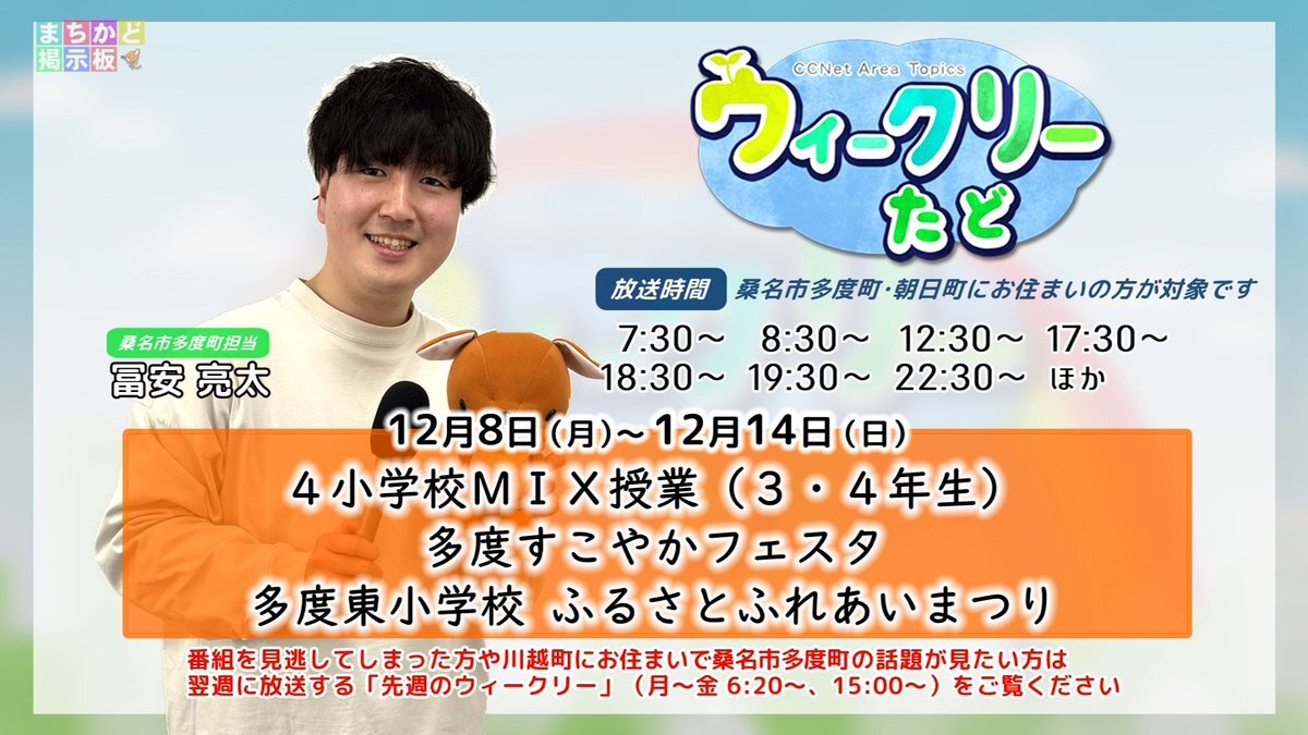 12月8日~12月14日放送の「ウィークリーたど」はご覧の内容をお届けします! ✅4小学校MIX授業(3・4年生) ✅多度すこやかフェスタ ✅多度東小学校 ふるさとふれあいまつり ぜひご覧ください! #多度町 #CCNet pic.x.com/U4KjmoVp5C