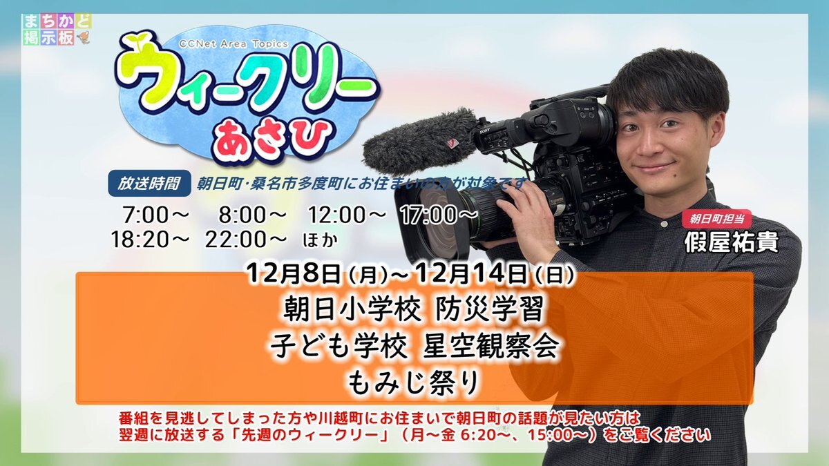 12月8日~12月14日放送の「ウィークリーあさひ」はご覧の内容をお届けします! ✅朝日小学校 防災学習 ✅子ども学校 星空観察会 ✅もみじ祭り ぜひご覧ください! #朝日町 #CCNet pic.x.com/nHYfysgofl