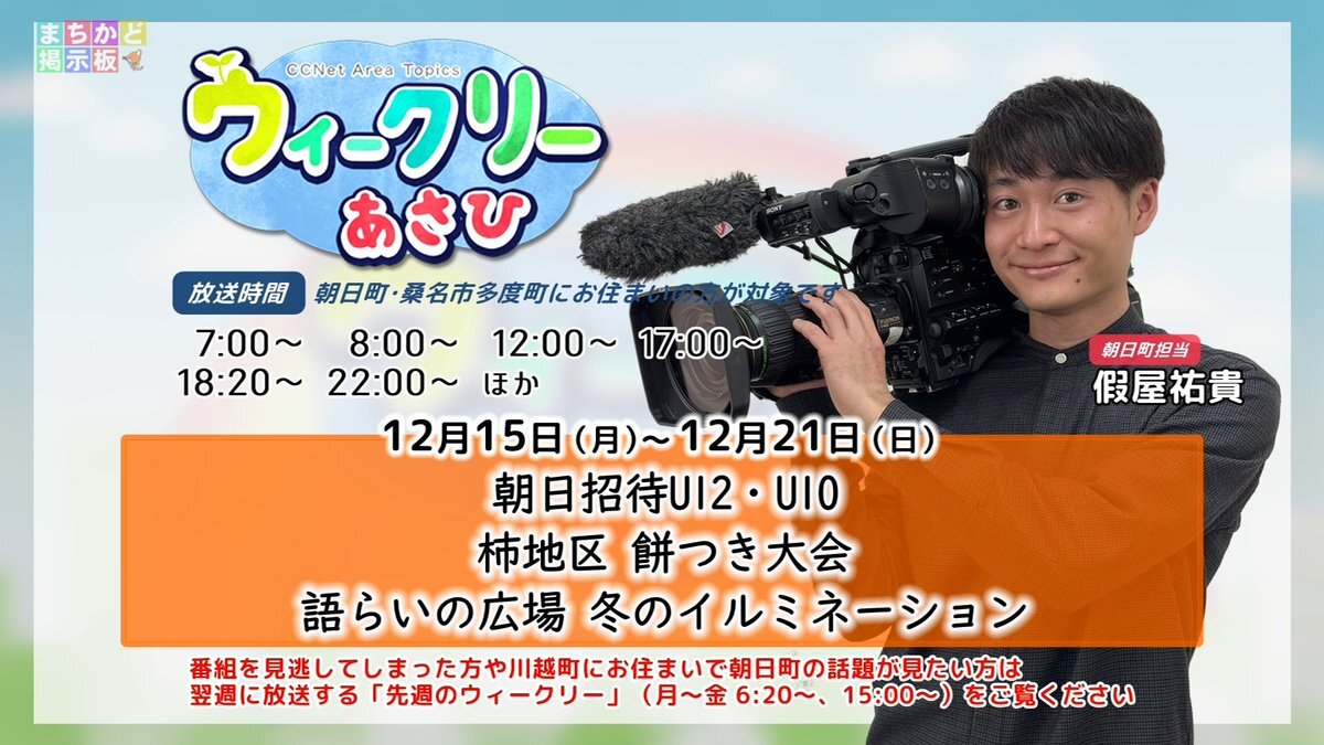 12月15日~12月21日放送の「ウィークリーあさひ」はご覧の内容をお届けします! ✅朝日招待U12・U10 ✅柿地区 餅つき大会 ✅語らいの広場 冬のイルミネーション ぜひご覧ください! #朝日町 #CCNet pic.x.com/eYqf1iAPzM