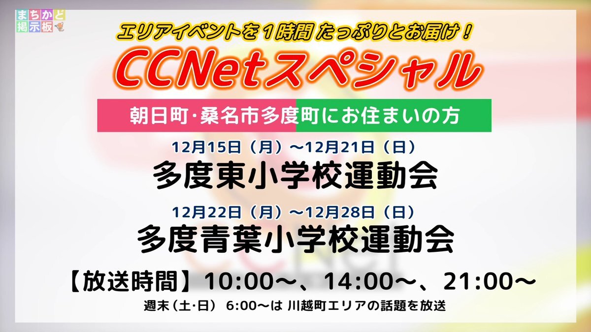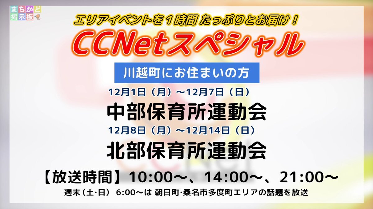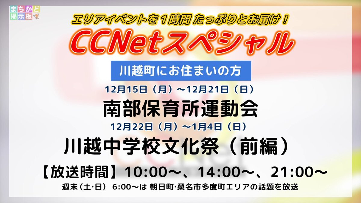 12月後半の「CCNetスペシャル」はご覧の内容をお届けします! ○川越町にお住まいの方 ✅南部保育所 運動会 ✅川越中学校 文化祭(前編) ○朝日町・多度町にお住まいの方 ✅多度東小学校 運動会 ✅多度青葉小学校 運動会 ぜひご覧ください! #川越町 #朝日町 #多度町 #CCNet pic.x.com/ewDtym8D4N