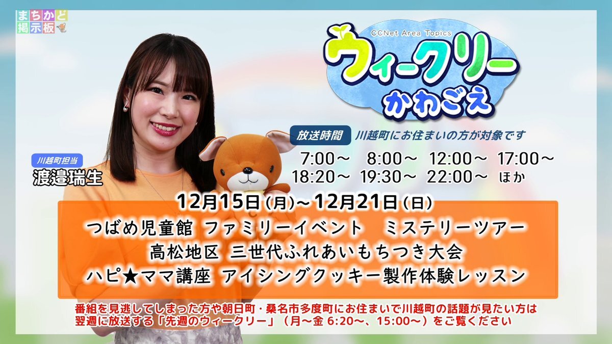 12月15日~12月21日放送の「ウィークリーかわごえ」はご覧の内容をお届けします! ✅つばめ児童館 ファミリーイベント ミステリーツアー ✅高松地区 三世代ふれあいもちつき大会 ✅ハピ★ママ講座 アイシングクッキー製作体験レッスン ぜひご覧ください! #川越町 #CCNet pic.x.com/v63pxl5SJe