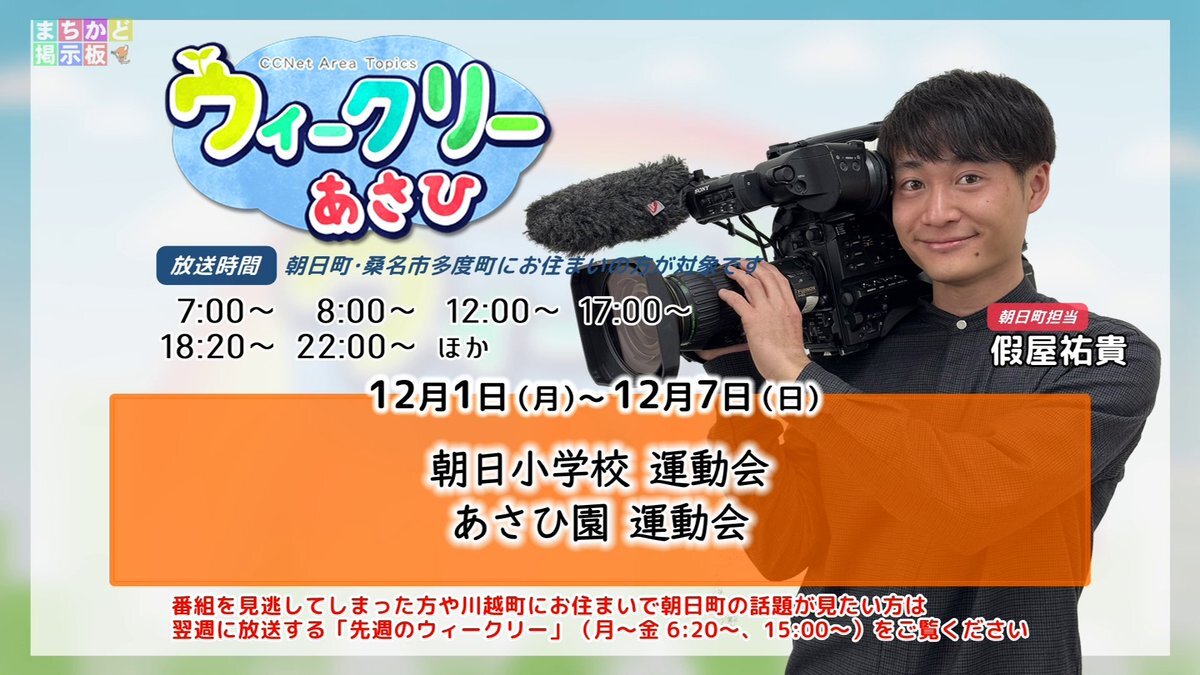 12月1日~12月7日放送の「ウィークリーあさひ」はご覧の内容をお届けします! ✅朝日小学校 運動会 ✅あさひ園 運動会 ぜひご覧ください! #朝日町 #CCNet pic.x.com/mPiUZ6SmZW