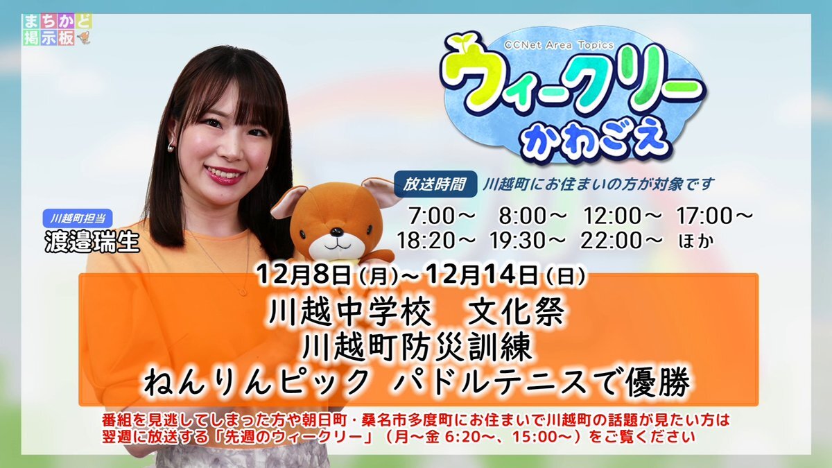 12月8日~12月14日放送の「ウィークリーかわごえ」はご覧の内容をお届けします! ✅川越中学校 文化祭 ✅川越町防災訓練 ✅ねんりんピック パドルテニスで優勝 ぜひご覧ください! #川越町 #CCNet pic.x.com/9tdVB9N2gY