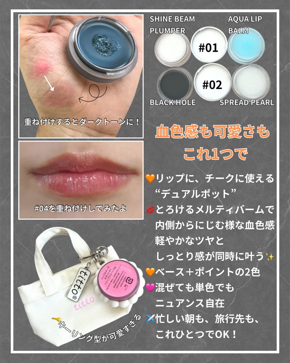 ヴィーガン&低刺激で敏感肌さんにも🌿 詳細はこちらをみてみてね𐔌՞⸝⸝ʚ̴̶̷̷ · ʚ̴̶̷̷⸝⸝ ՞𐦯💭👇 qoo10.jp/shop/titto @titto_cosmetic #titto #lipbalm #cheek #キーリングコスメ #持ち歩きコスメ #リップチャーム #lip&cheek #summermakeup #kbeauty