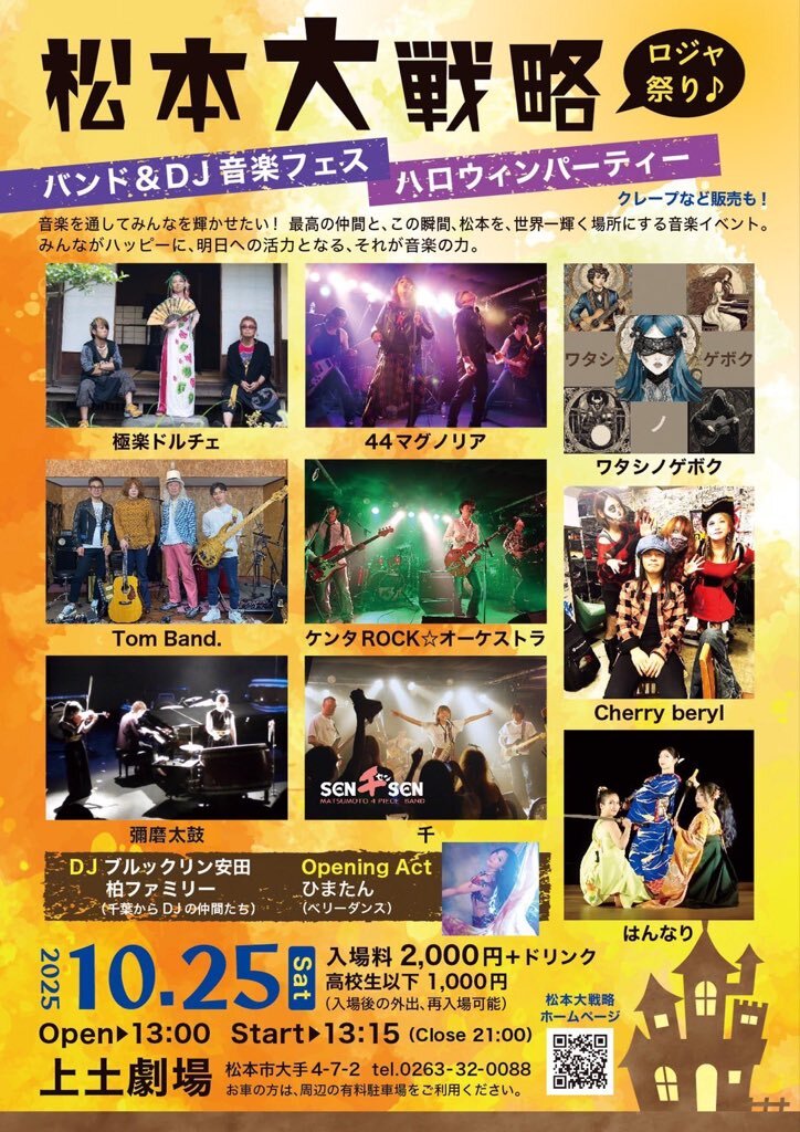 10/25(土) 松本 上土劇場 "松本大戦略" OPEN 13:00 START 13:15 入場料 ¥2000+D 高校生以下 ¥1000 #極楽ドルチェ #Tom Band. #彌磨太鼓 #44マグノリア #ケンタROCK☆オーケストラ # #ワタシノゲボク #Cherry beryl #はんなり #ブルックリン安田 #柏ファミリー #ひまたん pic.x.com/hruBwqXKss