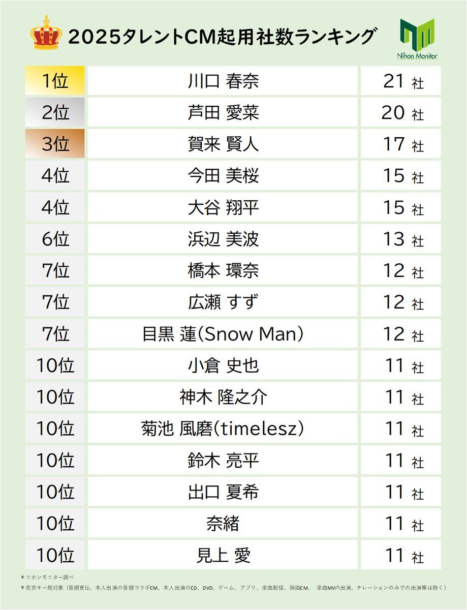 ✨ニホンモニター 発表✨ 📺2025タレントCM起用社数ランキング 川口春奈さんが堂々の3年連続首位🎊 1位 川口春奈 2位 芦田愛菜 3位 賀来賢人 4位 今田美桜、大谷翔平 6位 浜辺美波 7位 橋本環奈、広瀬すず、目黒蓮(Snow Man) 10位