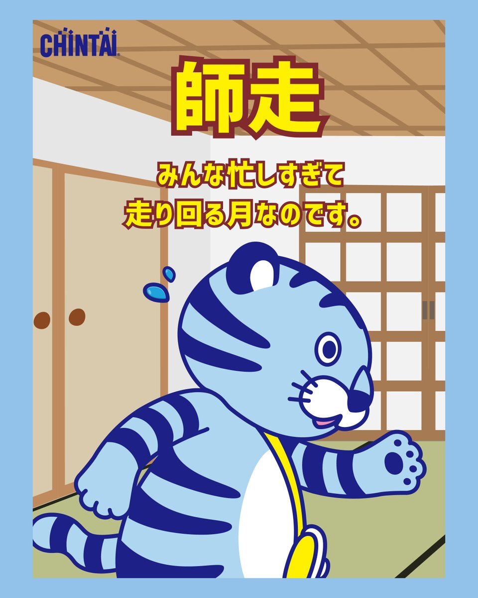 12月の和風月名は(わふうげつめい)は、 【師走(しわす)】なのです~💦 12月は年末の法事や行事が多く、お坊さん(師)があちこちに走り回る様子が語源となっているのです~ 今年もあと1ヶ月なのです! 後悔のないよう毎日大切にすごすのです〜🐯 #CHINTAI #スマホでCHINTAI #チンタイガー pic.x.com/1zsPtbc5oe