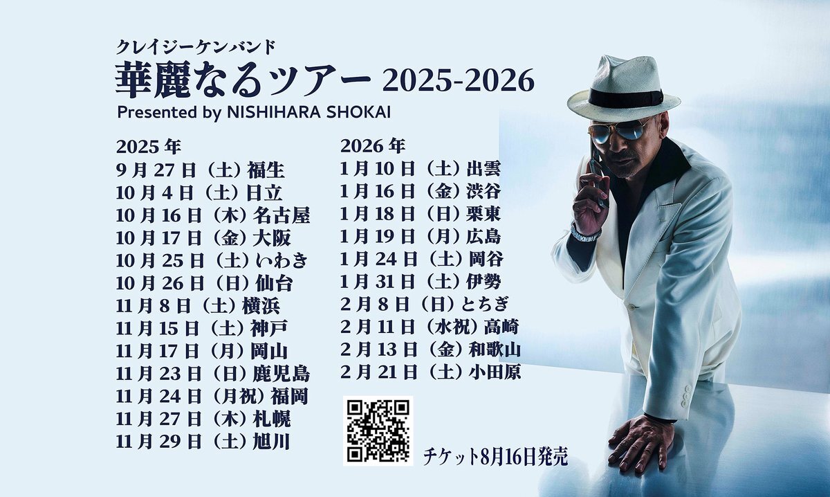 🗨️本日(11/8)開催💬 クレイジーケンバンド CRAZY KEN BAND 華麗なるツアー2025-2026 Presented by NISHIHARA SHOKAI 📍横浜BUNTAI 当日券は15:00より販売します。 red-hot.ne.jp/play/detail.ph… #クレイジーケンバンド #CKB