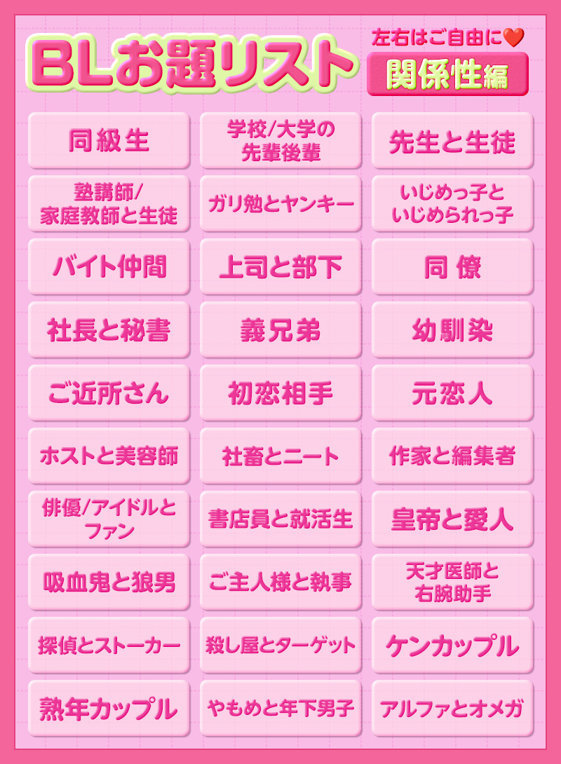 ❥・・・ ┈┈┈┈┈┈┈ ・・・❥  BLお題リスト ~関係性編~ ❥・・・ ┈┈┈┈┈┈┈ ・・・❥ BL漫画を描くのは大好き!でも0から創作ネタを考えるのは大変…という方へ #comico #WEBTOON_BL漫画賞 担当者・ねもが独断で考えた【関係性30個】×【話のきっかけ30個】を紹介しちゃいます😘 pic.x.com/aB3cjPyEQF