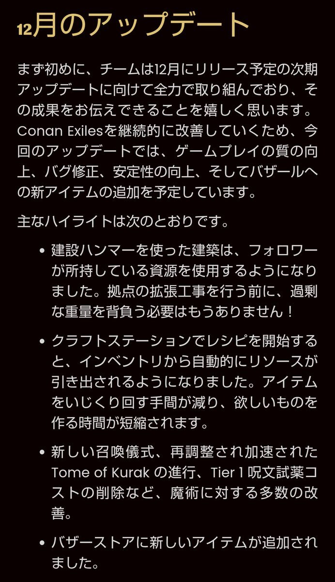 タグ付けのために引用! 12月にくるアップデートの予告がありました!🙌 #コナンアウトキャスト #ConanExiles #ConanOutcasts pic.x.com/QL33cDIj3c x.com/ConanExiles/st…