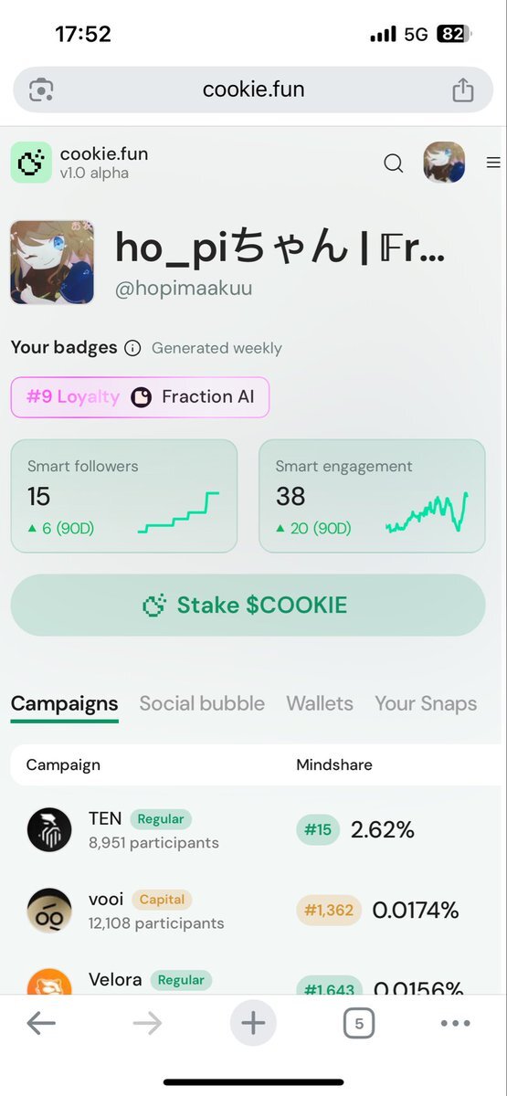 こんばんは!あまりの寒さに今日からダウン着てます🥶 しかし@cookiedotfun は熱いイベントを沢山行っています⤴️@tenprotocol日本人リーダーボードイベントも間も無く終了⁉️何とか15位で終えられるかな🎉 🔟/🔟 マインドシェアは少し下がりましたがモチベーションはむしろUP⤴️してます! #cookie pic.x.com/S6B9j51Gjc x.com/hopimaakuu/sta…