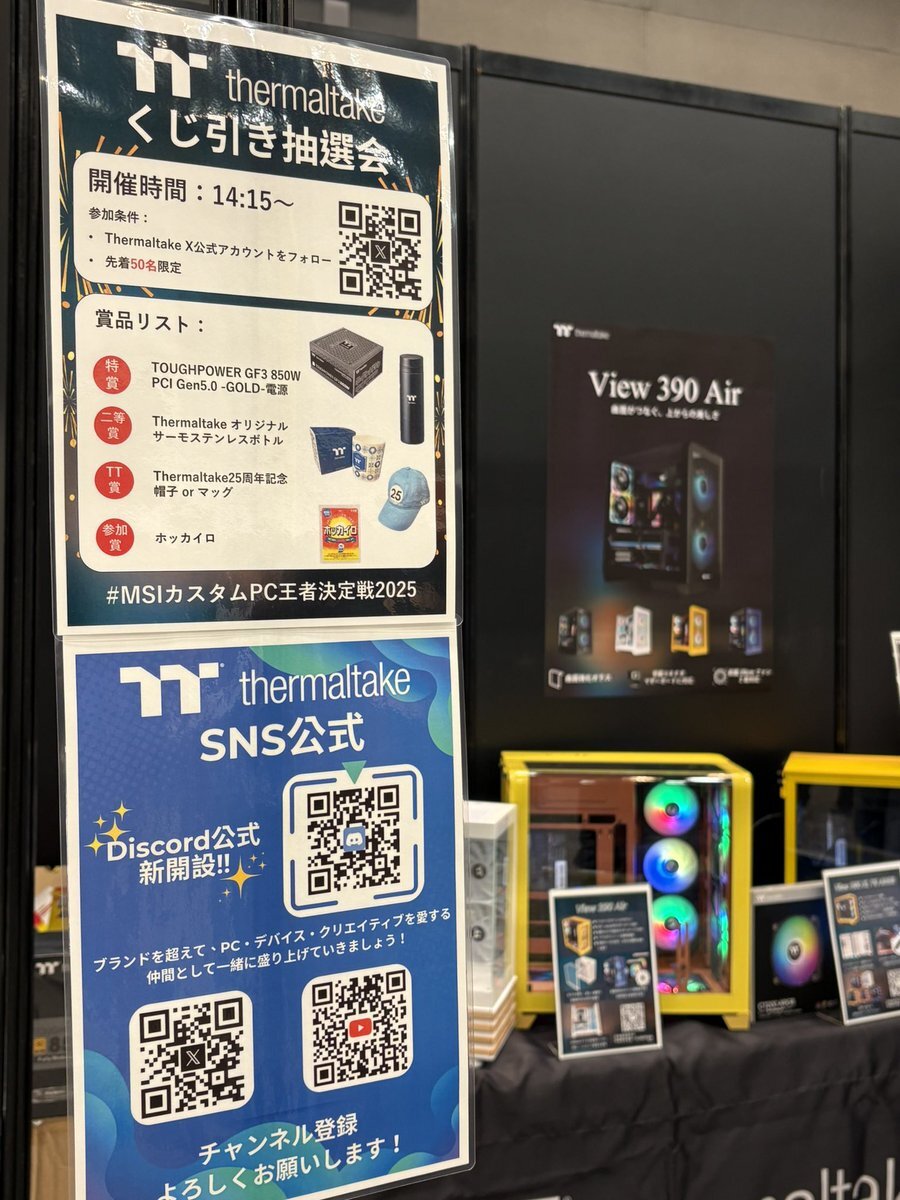 クーラーマスターさんとサーマルテイクさんの製品も見ることができますよー! サーマルテイクさんは抽選会もやっています✨ #thermaltake #coolermaster #msi #MSI王者決定戦2025 pic.x.com/Bm2OEMnQbX