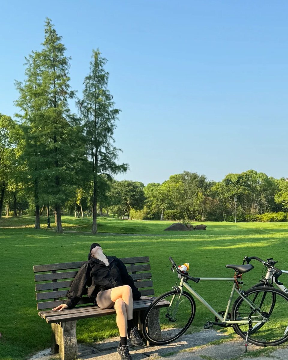 自転車で公園に来て、そのままベンチにへたり込んだ笑、疲れすぎ!秋風が少し冷たくて、緑の芝生と青空が超癒し、自転車に小さな人形がぶら下がってる、ちょっと休んでまた探索!#CyclingLife #AutumnJoy #LazyMoment ✨🌬️ pic.x.com/bd7hvl1YBK