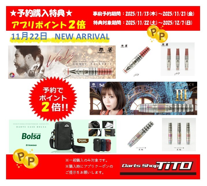 熊本SHOPオープンしましたー! 11/22(土)発売の新商品 ◆Valz ◆AKARI LEGACYⅢ 試投されましたかー? 事前予約でアプリポイント2倍です! ぜひ店頭にてお試しくださいね♪ 本日も22時まで! 沢山のご来店お待ちしてますよ~🐺 #Darts #TiTO #熊本 pic.x.com/ghHXPcZ7kJ