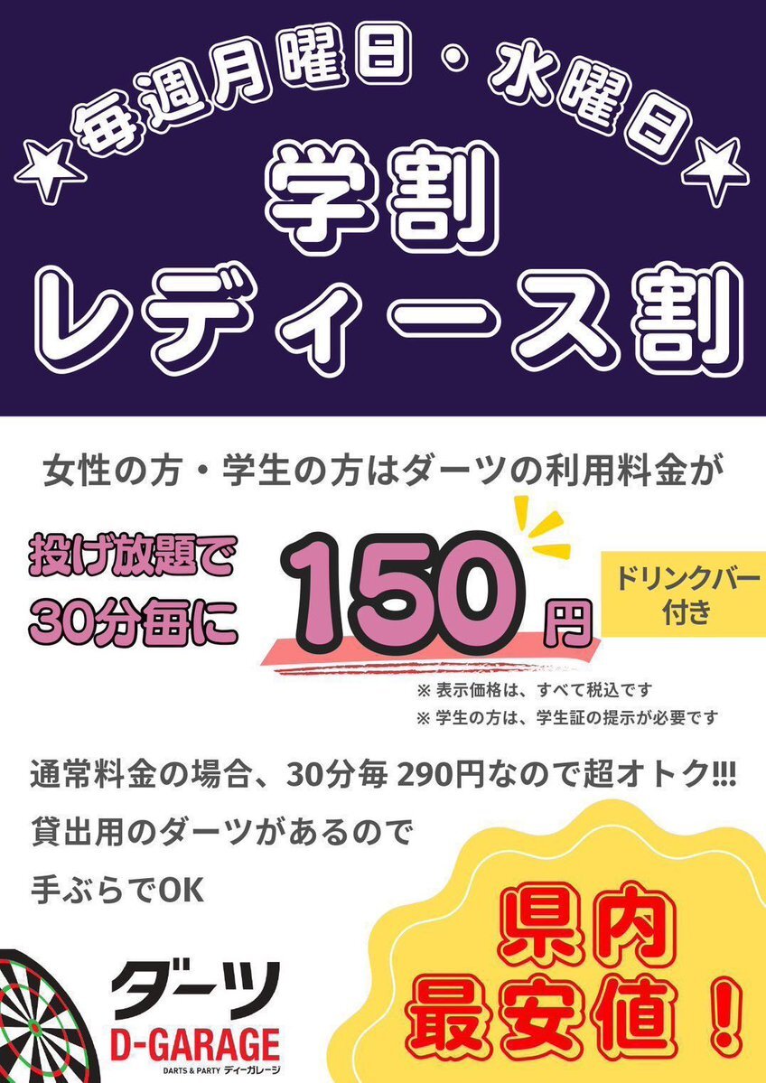 本日、全店で学割&レディースDAYです‼️ 学生と女性の方はご利用料金が 投げ放題で30分毎に150円です🧚🏻️✨ (学生の方は学生証の提示をお願いします) ご来店お待ちしております( ^ ^ )/ #ダーツ #ダーツバー #darts pic.x.com/SmIkcMeviK