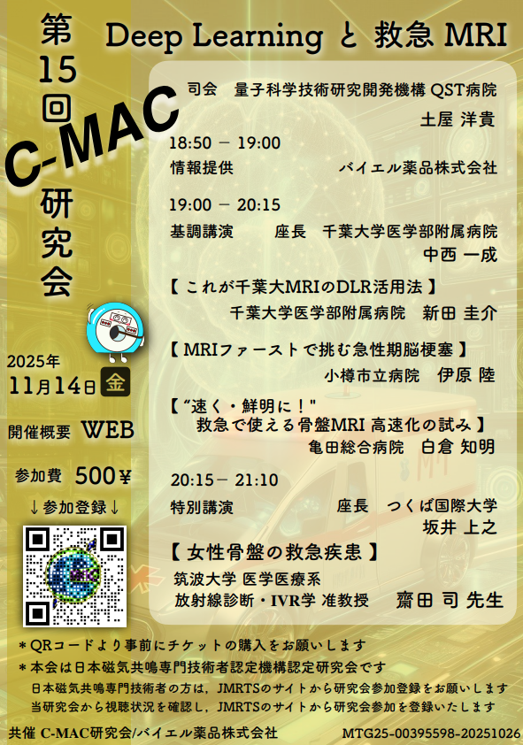 ✅ 第15回 C-MAC研究会 【第15回 C-MAC研究会】 11月14日(金)19:00~21:10 Web開催|参加費500円 DLR・脳梗塞・骨盤救急MRIがテーマ 千葉・小樽・亀田・筑波のMRIスペシャリストが登壇! #MRI #救急MRI #DeepLearning #CMAC研究会 pic.x.com/13lSVMN4vW