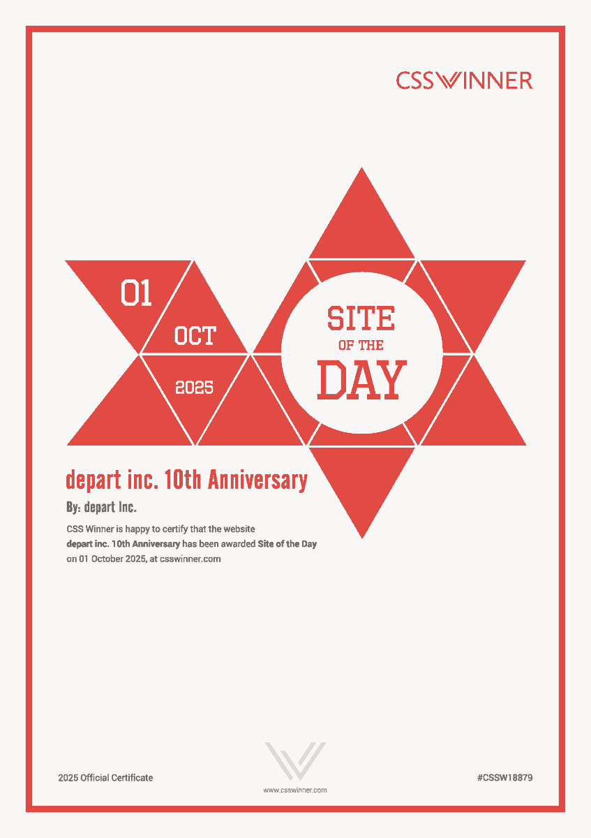 🏆受賞リリース✨ 弊社制作の「株式会社デパート 10周年記念サイト」が国際的なWebデザインアワード「CSS Winner」にて「Site of the Day」を受賞いたしました! depart-inc.com/news/news-2510… #Awards #SOTD #designer pic.x.com/hIGKweaUGH