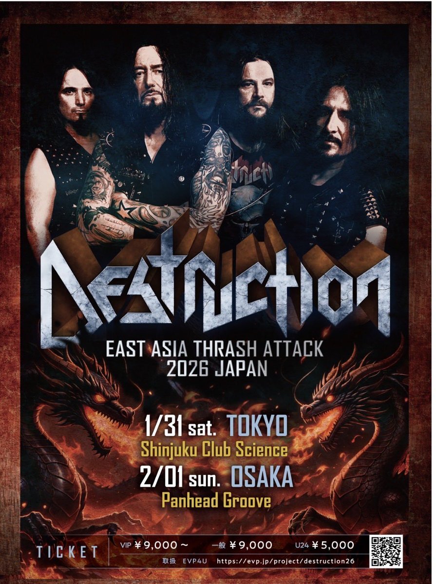 【新規公演】 ジャーマン・スラッシュ三羽ガラスの一つ「Destruction」が2018年以来、8年ぶりに日本へ帰ってくるぞ! 2026年 1月31日(土)東京 club Science 2月1日(日)大阪 Panhead Groove 4人編成の彼らによる強烈なステージを受け止めよう! チケット発売は来週末を予定。乞うご期待!