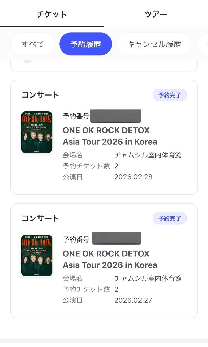 韓国2日目もキャンセル拾えました!! しかも2連で! 朝の6時にこれ以外で1枚もキャンセルでてた🐱 夜中とか朝方の方が出る確率高いかも🥺 #DETOX #ワンオク pic.x.com/2m5Yi6yYSR