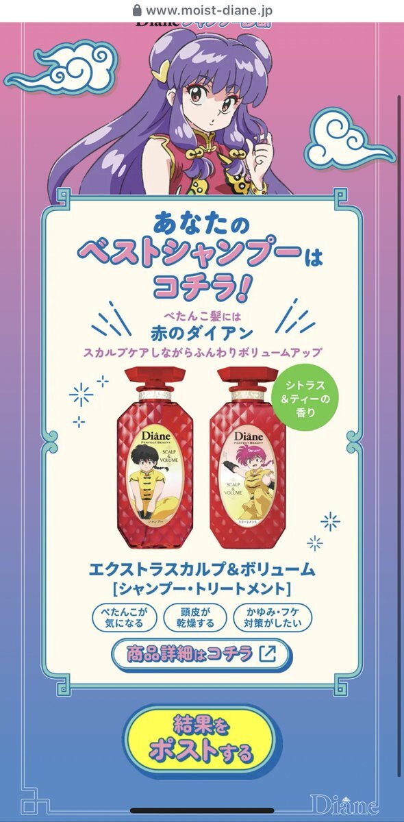\診断結果🛁✨/ 私にピッタリのシャンプーはコレ🧴 https://t.co/PwiJILNTVj みんなも診断して結果をシェアしてね💜 あなたに合うダイアンが見つかるかも✨ moist-diane.jp/shindan/ #ダイアン #Diane #らんまアニメ ちょうどコラボのやつ探してたから有難い これいつから販売だろう❓