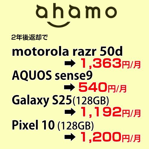 PR 6:31 ahamoへMNPだと ♦️2年後返却 motorola razr 50d 👉1363円/月 AQUOS sense9 👉540円/月 Galaxy S25 👉1192円/月 Google Pixel 10 128GB👉1200円/月 Google Pixel 9a 128GB👉38円/月 ⚠️割引価格は最終画面で表示なので途中不安かも #docomo #ahamo 👉️ tr.affiliate-sp.docomo.ne.jp/cl/d0000001629… ⤴️ pic.x.com/R3wNVZTtUb