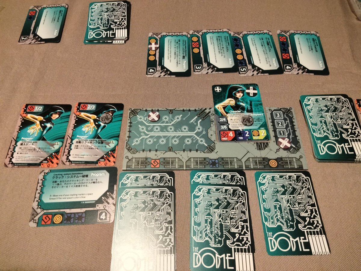#DOME 核戦争後「ドーム」内しか生存域がなくなった世界で電子戦を繰り広げるカードバトル #ボドゲ 。 自分のデッキからのカードプレイのほか、共通カードの入手&プレイが特徴。キャラは4人でデッキが全員違う。1VS1とボスVS他全員の非対称バトルが出来る。 多分レアゲー🃏✨️ #ボードゲーム pic.x.com/j9OpchZeh3