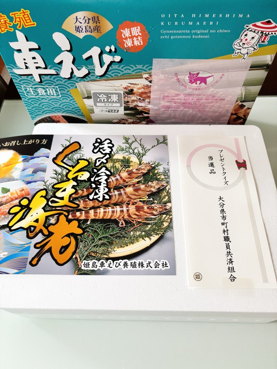 🧸𖤐⡱当選しました🧸𖤐⡱ #共済通信おおいた 様 ありがとうございます♡ 🌟#大分県姫島村 #車えび .·˖*✩⡱ きゃー!車えび大好き🐰。:ஐ..*✨☆ 家族と美味しくいただきます! 今回、15名当選だった°ʚ🎀ɞ°. この度は素敵な #ブレゼント ありがとうございました♪ #double当選報告 pic.x.com/xu2VscTeo4